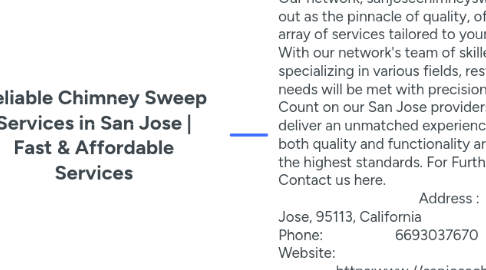 1. Welcome to the San Jose Chimney Sweeping network, where excellence meets your needs. Our network, sanjosechimneysweep.us, stands out as the pinnacle of quality, offering a diverse array of services tailored to your requirements. With our network's team of skilled professionals specializing in various fields, rest assured your needs will be met with precision and care. Count on our San Jose providers' experts to deliver an unmatched experience, ensuring both quality and functionality are maintained at the highest standards. For Further Detail Contact us here. Address : East Santa Clara Street, San Jose, 95113, California Phone: 6693037670 Website: https:www.//sanjosechimneysweep.us Service Hours : : Mon-Sat (9:00-18:00) Sun (9:00-15:00)