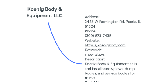 1. Address: 2428 W Farmington Rd, Peoria, IL 61604 Phone: (309) 673-7435 Website: https://koenigbody.com Keywords: snow plows Description: Koenig Body & Equipment sells and installs snowplows, dump bodies, and service bodies for trucks. Social Links: https://www.facebook.com/KOENIGBODY/ https://www.instagram.com/koenigbody/ https://twitter.com/BodyKoenig Hours: Monday-Friday: 7:30AM–5PM Saturday-Sunday: Closed