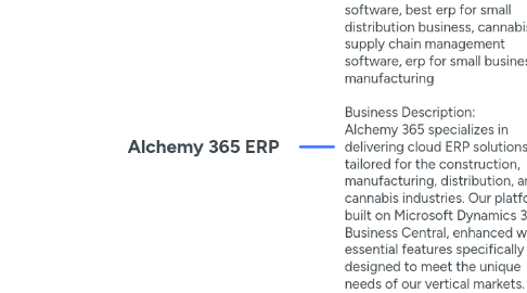 1. Address: 219 North Main Ave, Unit #184, Scranton, PA 18504 Phone: 845-800-3358 Email: contact@alchemy365erp.com Website: https://alchemy-365.com/ Keywords: construction erp, cannabis erp, distribution erp, manufacturing erp, erp for Distribution, Chemical Manufacturing erp, cannabis erp software, best erp for small distribution business, cannabis supply chain management software, erp for small business manufacturing Business Description: Alchemy 365 specializes in delivering cloud ERP solutions tailored for the construction, manufacturing, distribution, and cannabis industries. Our platform is built on Microsoft Dynamics 365 Business Central, enhanced with essential features specifically designed to meet the unique needs of our vertical markets. We go beyond the standard offerings of Business Central, providing customized solutions that drive efficiency, productivity, and growth for our clients. At Alchemy 365, we transform business operations with innovative, industry-focused technology. Hours: Monday-Sunday: 9am-5pm Social Links: https://www.linkedin.com/company/alchemy-365-erp https://www.youtube.com/@Alchemy-365-ERP GMB: https://maps.app.goo.gl/xG9n7ibjineGVt1PA
