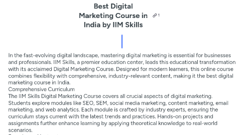 1. In the fast-evolving digital landscape, mastering digital marketing is essential for businesses and professionals. IIM Skills, a premier education center, leads this educational transformation with its acclaimed Digital Marketing Course. Designed for modern learners, this online course combines flexibility with comprehensive, industry-relevant content, making it the best digital marketing course in India. Comprehensive Curriculum The IIM Skills Digital Marketing Course covers all crucial aspects of digital marketing. Students explore modules like SEO, SEM, social media marketing, content marketing, email marketing, and web analytics. Each module is crafted by industry experts, ensuring the curriculum stays current with the latest trends and practices. Hands-on projects and assignments further enhance learning by applying theoretical knowledge to real-world scenarios. Experienced Instructors Seasoned professionals with years of digital marketing experience lead the course. Their practical insights and mentorship provide students with a deep understanding of the digital marketing ecosystem. Interactive online classes enable direct engagement with instructors, allowing students to clarify doubts and gain deeper insights into complex topics. Flexible Learning The IIM Skills Digital Marketing Course offers flexibility, making it ideal for working professionals and students. The online format allows students to learn at their own pace, with classes available on weekends and weekdays. Recorded sessions are also accessible for those who may miss a live class. Certification and Placement Support Upon completing the course, students receive a certification from IIM Skills, validating their expertise in digital marketing. The institute provides robust placement support, helping students connect with leading companies and start their careers in digital marketing. In conclusion, IIM Skills’ Digital Marketing Course stands out for its comprehensive curriculum, expert instructors, flexible learning options, and strong placement support. Whether you're a novice or a professional seeking to upgrade your skills, this course is the perfect platform to achieve your goals.
