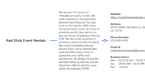 1.1. **Website:** https://redstickeventrentals.com/ **Address:** 12070 White Oak Plains Ln, Baker, LA, 70714 **Phone Number:** 225-205-4109 **Email Id:** redstickeventrentals@gmail.com **Business Hours:** Mon - Fri:07:30 AM - 05:00 PM Sat :09:30 AM - 03:30 PM Sun :Closed