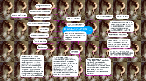 4. ÁLVARES DE AZEVEDO: (ironia,amor e morte), usou temas de desespero passionais sendo eles séria e a irônica. Apresentou-se como sendo o primeiro a trazer a ironia para a cena romântica. Fez a "Lira dos vinte anos", uma obra como fascínio pela ideia de morrer e a atração pelas virgens pálidas e frias. O amor se torna platônico.