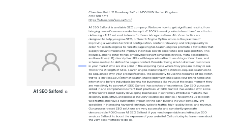 1. Chandlers Point 31 Broadway Salford M50 2UW United Kingdom 0161 768 6317 https://a1seo.com/seo-salford/ A1 SEO Salford is a reliable SEO company. We know how to get significant results, from bringing new eCommerce websites up to ₤ 200K in weekly sales in less than 6 months to delivering a ₤ 1.5 m boost in leads for financial organisations. All of our tactics are designed to help you grow.SEO, or Search Engine Optimisation, is the practise of improving a website's technical configuration, content relevancy, and link popularity in order for search engines to rank its pages higher.Search engines promote SEO tactics that supply relevant material to improve individual search experience and page position. This includes, among other things, employing relevant keywords in titles, meta descriptions, and headlines (H1), descriptive URLs with keywords rather than strings of numbers, and schema markup to define the page's content.Consider being able to discover customers in your market who are at a point in the acquiring cycle where they prepare to buy or ask. That is the strength of SEO. Search engine marketing, by definition, requires searchers to be acquainted with your product/service. The possibility to use this resource of top notch traffic is limitless.SEO (internet search engine optimization) places your brand name and internet site before individuals looking for businesses like yours at the exact moment they are most likely to convert.A1 SEO Salford has a riches of experience. Our SEO gurus are skilled in and comprehend current best practises. A1 SEO Salford has worked with some of the world's most rapidly developing businesses in extremely affordable markets. We diligently plan, strive, and possess industry-leading experience. This permits us to boost web traffic and have a substantial impact on the cash putting via your company. We specialise in increasing keyword rankings, website traffic, high-quality leads, and revenue. Our process-based SEO solutions are very successful and constantly generate demonstrable ROI.Choose A1 SEO Salford if you need dependable and effective SEO services Salford to boost the exposure of your website! Call us today to learn more about the very best methods to do so.
