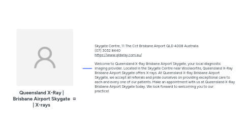 1. Skygate Centre, 11 The Cct Brisbane Airport QLD 4008 Australia (07) 3032 8440 https://www.qldxray.com.au/ Welcome to Queensland X-Ray Brisbane Airport Skygate, your local diagnostic imaging provider. Located in the Skygate Centre near Woolworths, Queensland X-Ray Brisbane Airport Skygate offers X-rays. At Queensland X-Ray Brisbane Airport Skygate, we accept all referrals and pride ourselves on providing exceptional care to each and every one of our patients. Make an appointment with us at Queensland X-Ray Brisbane Airport Skygate today. We look forward to welcoming you to our practice!