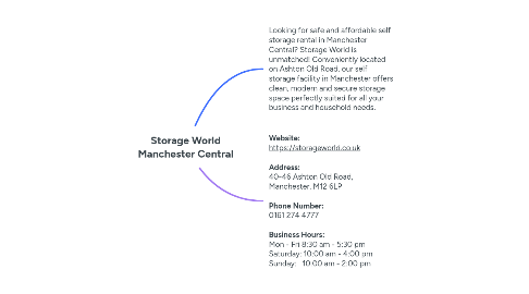 2. **Website:** https://storageworld.co.uk **Address:** 40-46 Ashton Old Road, Manchester, M12 6LP **Phone Number:** 0161 274 4777 **Business Hours:** Mon - Fri 8:30 am - 5:30 pm Saturday: 10:00 am - 4:00 pm Sunday: 10:00 am - 2:00 pm