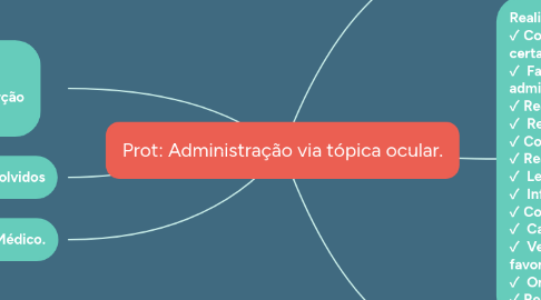 3. Realizar a higienização das mãos; ✓Conferir os nove certos: paciente certo, medicamento certo, dose certa, hora certa, via certa, registro certo, diluição certa s/n, riscos aos profissionais e riscos ao paciente; ✓ Fazer o rótulo de identificação do medicamento com: nome, dose, horário, via de administração e paciente; ✓Realizar a desinfecção da bandeja com álcool a 70% ✓ Reunir o material a ser utilizado na bandeja; ✓Colocar a identificação no medicamento; ✓Realizar a higienização das mãos. ✓ Levar a bandeja até a unidade do paciente e coloca-la na mesa de cabeceira; ✓ Informar o procedimento ao paciente, se possível; ✓Conferir o rótulo com os dados do paciente e a prescrição médica; ✓ Calçar luvas de procedimento; ✓ Verificar a presença de secreção ocular e promover a limpeza, se necessário, para favorecer o contato do medicamento com a mucosa; ✓ Orientar o paciente que permaneça sentado ou deitado com o pescoço hiperestendido; ✓Realizar anotações de enfermagem.