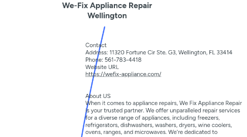 1. Contact Address: 11320 Fortune Cir Ste. G3, Wellington, FL 33414 Phone: 561-783-4418 Website URL https://wefix-appliance.com/ About US When it comes to appliance repairs, We Fix Appliance Repair is your trusted partner. We offer unparalleled repair services for a diverse range of appliances, including freezers, refrigerators, dishwashers, washers, dryers, wine coolers, ovens, ranges, and microwaves. We're dedicated to providing you with top-quality solutions for all your appliance woes. What sets us apart is our unwavering commitment to excellence. We not only fix your appliances, but we also provide peace of mind through our comprehensive guarantees. Our labor is backed by a 90-day warranty, ensuring that our work stands the test of time. Moreover, we go a step further by providing a warranty of up to 12 months on all installed parts. This means that when you choose us, you're choosing long-lasting solutions and reliability. We understand that your satisfaction is paramount. If, for any reason, you find our service less than satisfactory, we're here to make things right. We're committed to your contentment and will schedule a follow-up appointment to address your concerns. Your peace of mind is our priority, and we stand behind our work. Related Searches Appliance repair service | appliance repair service near me | appliances repair | repair my appliance | washer repair | dryer repair | refrigerator repair | dishwasher repair | oven repair | stove repair | range repair | home appliance repair | repairman near me | best repairman | home appliance repairman | Wellington | FL Additional Details Working Hours: Mon – Sun 8 AM–6 PM Payment method: Cash , check , all cc GMB Listing https://www.google.com/maps?cid=10598865032158191230