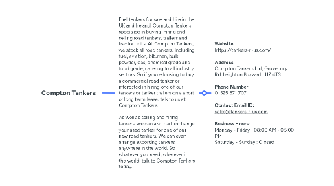 1.1. **Website:** https://tankers-r-us.com/ **Address:** Compton Tankers Ltd, Grovebury Rd, Leighton Buzzard LU7 4TS **Phone Number:** 01525 371 707 **Contact Email ID:** sales@tankers-r-us.com **Business Hours:** Monday - Friday : 08:00 AM - 05:00 PM Saturday - Sunday : Closed