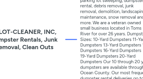 1. A-LOT-CLEANER, INC. provides a diversified package of property maintenance services including parking lot sweeping, dumpster rental, debris removal, junk removal, demolition, landscaping maintenance, snow removal and more. We are a veteran owned small business located in Toms River for over 26 years. Dumpster Sizes: 10-Yard Dumpsters 11-Yard Dumpsters 13-Yard Dumpsters 15-Yard Dumpsters 16-Yard Dumpsters 19-Yard Dumpsters 20-Yard Dumpsters Our 10 through 20 yard dumpsters are available throughout Ocean County. Our most frequent dumpster rental deliveries go to Toms River, NJ, Brick, NJ, Jackson, NJ, Lacey, Beachwood, Lakewood, NJ.