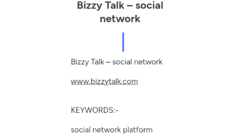 1. Bizzy Talk – social network www.bizzytalk.com KEYWORDS:- social network platform online marketplace buy and sell online swap goods online online classified ads connect with friends online social network marketplace banner ads online advertising on social networks social media for selling sell items online buy products online online swapping platform peer to peer marketplace personal ads platform family networking site worldwide social network sell goods online social media marketplace ecommerce social network banner advertising services community selling site online trade platform marketplace for selling goods advertise on social media connect with family online talk to the world online promote products on social network social ecommerce platform swap marketplace online