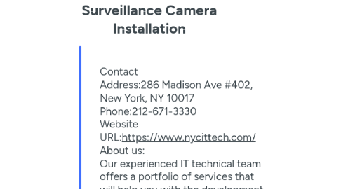 1. Contact Address:286 Madison Ave #402, New York, NY 10017 Phone:212-671-3330 Website URL:https://www.nycittech.com/ About us: Our experienced IT technical team offers a portfolio of services that will help you with the development and implementation of your unique business IT needs. The key to success of our IT consultancy service is to understand our clients, their business activities and what they wish to achieve. Our goal is to help you gain optimum value from your IT investments, while maintaining competitive rates on all the services offered. We take pride on always being there for our loyal customers no matter the time of day, our goals are to ensure that your IT infrastructure is always running. Our services include audio video installations, IT & Tech Support, VoIP Phone System Installation, Network Installations. We can provide security solutions that are tailored to your specific needs and budget. our trained network technicians will be able to find the best possible solution for your environment. We can give you access to your equipment from anywhere in the world, as long as you have an internet connection and a personal computer you will be able to monitor your Home or Business how you see fit. We are one of the reputed security system service provider company in New York and offer best in class services for all your security needs. Related searches: ech audio camera installation nyc,video camera installation nyc,CCTV camera installation nyc,surveillance camera installation nyc,tech audio camera installation manhattan,video camera installation manhattan,CCTV camera installation manhattan,surveillance camera installation manhattan,Manhattan, NYC,New York,NY. Additional Details: Hours:Mon- Fri 9 am - 6 pm Payment Method:Cc, cash GMB Listing:https://www.google.com/maps?cid=6771287905661830025