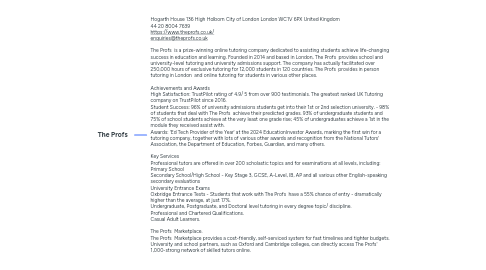 1. Hogarth House 136 High Holborn City of London London WC1V 6PX United Kingdom 44 20 8004 7639 https://www.theprofs.co.uk/ enquiries@theprofs.co.uk The Profs is a prize-winning online tutoring company dedicated to assisting students achieve life-changing success in education and learning. Founded in 2014 and based in London, The Profs provides school and university-level tutoring and university admissions support. The company has actually facilitated over 250,000 hours of exclusive tutoring for 12,000 students in 120 countries. The Profs provides in person tutoring in London and online tutoring for students in various other places. Achievements and Awards High Satisfaction: TrustPilot rating of 4.9/ 5 from over 900 testimonials. The greatest ranked UK Tutoring company on TrustPilot since 2016. Student Success: 96% of university admissions students get into their 1st or 2nd selection university. - 98% of students that deal with The Profs achieve their predicted grades. 93% of undergraduate students and 75% of school students achieve at the very least one grade rise; 45% of undergraduates achieve a 1st in the module they received assist with. Awards: 'Ed Tech Provider of the Year' at the 2024 EducationInvestor Awards, marking the first win for a tutoring company, together with lots of various other awards and recognition from the National Tutors' Association, the Department of Education, Forbes, Guardian, and many others. Key Services Professional tutors are offered in over 200 scholastic topics and for examinations at all levels, including: Primary School Secondary School/High School - Key Stage 3, GCSE, A-Level, IB, AP and all various other English-speaking secondary evaluations University Entrance Exams Oxbridge Entrance Tests - Students that work with The Profs have a 55% chance of entry - dramatically higher than the average, at just 17%. Undergraduate, Postgraduate, and Doctoral level tutoring in every degree topic/ discipline. Professional and Chartered Qualifications. Casual Adult Learners. The Profs Marketplace. The Profs Marketplace provides a cost-friendly, self-serviced system for fast timelines and tighter budgets. University and school partners, such as Oxford and Cambridge colleges, can directly access The Profs' 1,000-strong network of skilled tutors online.