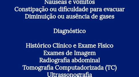 Definição Bloqueio total ou parcial do intestino Impede a passagem de alimentos, líquidos e gases Causas Mecânicas Adesões (cicatrizes de cirurgias anteriores) Hérnias Tumores Impactação fecal Funcionais Íleo paralítico (paralisia do intestino) Distúrbios neuromusculares Sintomas Dor abdominal Distensão abdominal Náuseas e vômitos Constipação ou dificuldade para evacuar Diminuição ou ausência de gases Diagnóstico Histórico Clínico e Exame Físico Exames de Imagem Radiografia abdominal Tomografia Computadorizada (TC) Ultrassonografia Exames Complementares Endoscopia (para visualizar diretamente) Tratamento Conservador Jejum Hidratação intravenosa Sonda nasogástrica (para descompressão) Cirúrgico Remoção de obstrução Correção de hérnias Ressecação de segmentos afetados Complicações Perfuração intestinal Sepse (infecção generalizada) Necrose intestinal (morte do tecido) Desidratação e desequilíbrios eletrolíticos