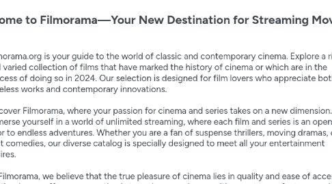 1. Filmorama.org is your guide to the world of classic and contemporary cinema. Explore a rich and varied collection of films that have marked the history of cinema or which are in the process of doing so in 2024. Our selection is designed for film lovers who appreciate both timeless works and contemporary innovations. Discover Filmorama, where your passion for cinema and series takes on a new dimension. Immerse yourself in a world of unlimited streaming, where each film and series is an open door to endless adventures. Whether you are a fan of suspense thrillers, moving dramas, or light comedies, our diverse catalog is specially designed to meet all your entertainment desires. At Filmorama, we believe that the true pleasure of cinema lies in quality and ease of access. That's why we offer you an optimal streaming experience, with easy-to-use features and exceptional video quality, all accessible on a multitude of devices. Let yourself be captivated by our carefully chosen selection of films and series, updated regularly to include the latest hits as well as timeless classics. With Filmorama, every evening is an opportunity to experience unforgettable moments, from the comfort of your home. Join us on Filmorama today and start exploring the best of cinema and series, designed especially for streaming aficionados like you!