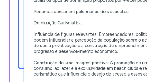 1.1. Quais os tipos de dominação propostos por Weber podem estar por trás deste fenômeno? Podemos pensar em pelo menos dois aspectos: Dominação Carismática: Influência de figuras relevantes: Empreendedores, políticos ou figuras públicas carismáticas podem influenciar a percepção da população sobre o acesso à praia, promovendo a ideia de que a privatização e a construção de empreendimentos de luxo são sinônimo de progresso e desenvolvimento econômico. Construção de uma imagem positiva: A promoção de um estilo de vida associado ao consumo, ao lazer e à exclusividade em beach clubs e resorts pode gerar um apelo carismático que influencia o desejo de acesso a esses espaços, mesmo que restrito. Dominação Legal: Legislação e regulamentação: A construção de condomínios e estabelecimentos comerciais na beira-mar é frequentemente amparada por leis e regulamentações que permitem a privatização de áreas litorâneas. Essas leis podem ser influenciadas por lobbies e grupos de interesse que se beneficiam da exploração comercial da praia. Aplicação da lei: A restrição do acesso à praia por meio de portarias, seguranças e outros mecanismos de controle é justificada pela aplicação de leis de propriedade privada e normas que regulamentam o uso do espaço público.