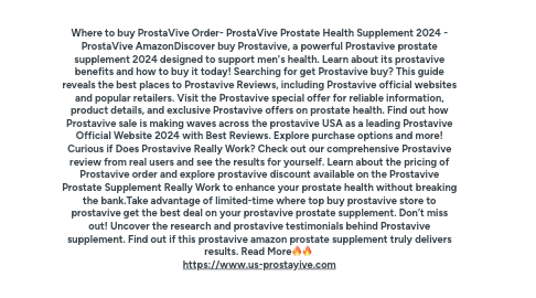 Where to buy ProstaVive Order- ProstaVive Prostate Health Supplement 2024 - ProstaVive AmazonDiscover buy Prostavive, a powerful Prostavive prostate supplement 2024 designed to support men's health. Learn about its prostavive benefits and how to buy it today! Searching for get Prostavive buy? This guide reveals the best places to Prostavive Reviews, including Prostavive official websites and popular retailers. Visit the Prostavive special offer for reliable information, product details, and exclusive Prostavive offers on prostate health. Find out how Prostavive sale is making waves across the prostavive USA as a leading Prostavive Official Website 2024 with Best Reviews. Explore purchase options and more! Curious if Does Prostavive Really Work? Check out our comprehensive Prostavive review from real users and see the results for yourself. Learn about the pricing of Prostavive order and explore prostavive discount available on the Prostavive Prostate Supplement Really Work to enhance your prostate health without breaking the bank.Take advantage of limited-time where top buy prostavive store to prostavive get the best deal on your prostavive prostate supplement. Don’t miss out! Uncover the research and prostavive testimonials behind Prostavive supplement. Find out if this prostavive amazon prostate supplement truly delivers results. Read More🔥🔥 https://www.us-prostayive.com