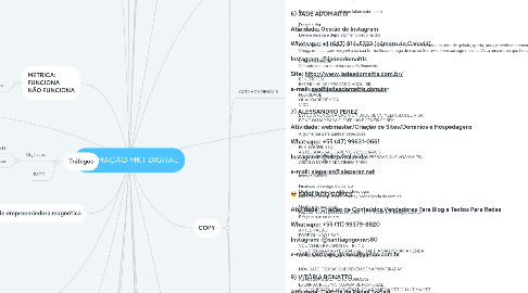 15. Equipa MKT: PROFISSIONAIS PARA VOCÊ CONTRATAR E FORMAR SUA EQUIPE: 1) MARCELO FERRÃO: Atividade: videomaker, direção de fimes, roteirista de documentário, editor de vídeos para youtube e redes sociais. Whatsapp: +55 (48) 99650-1237 ou (48) 9 9844-0512 Instagram: @marcelofsobreira e @greenup_audiovisual E-mail: contato@greenup.net.br 2) ANDRÉ REIS: Atividade: E-mail MKT, Ferramentas e Funil de Automação Whatsapp: +55 (34) 9 8807-2621 Instagram: @andrereisgama E-mail: andrereisgama@hotmail.com 3) MARINA PETINELLI Atividade: Copywriter e Jornalista Whatsapp: +55 (48) 9 8832-7528 Instagram: @marinapetinelli E-mail: marinapetinelli@gmail.com 4) SADI MACHADO Atividade: Gestor da Empresa Mulher Magnética Whatsapp: +55 (51) 9 9457-7117 Instagram: @sadivisk E-mail: sadi.machado@icloud.com 5) CARINE SANTOS E DANIEL JULIAN Atividade: Tradução de Textos e Cursos para Espanhol Whatsapp: +34 635 37 79 57 (número da Espanha) Instagram: @agenciaviewing 6) JADE ADOMAITIS Atividade: Gestão de Instagram Whatsapp: +1 (647) 914-5233 (número do Canadá) Instagram: @jadeadomaitis Site: http://www.jadeadomaitis.com.br/ e-mail: sac@jadeadomaitis.com.br 7) ALESSANDRO PEREZ Atividade: webmaster/Criação de Sites/Domínios e Hospedagens Whatsapp: +55 (47) 99631-0661 Instagram: @ale_vivalavida e-mail: aleperez@aleperez.net 8) SANTIAGO GOMES Atividade: Criação de Conteúdos Vendedores Para Blog e Textos Para Redes Whatsapp: +55 (11) 99379-8820 Instagram: @santiagogomes80 e-mail: santiago_gomes@yahoo.com.br 9) VITÓRIA BONATTO Atividade: Gestora de Redes Sociais Instagram: @vitoriabonatto E-mail: (48) 9 8808-0389