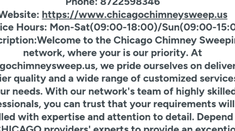 Business Name: CHICAGO CHIMNEYSWEEP SERVICE Address: South Michigan Avenue, CHICAGO, 60604, Illinois Phone: 8722598346 Website: https://www.chicagochimneysweep.us Service Hours: Mon-Sat(09:00-18:00)/Sun(09:00-15:00) Description:Welcome to the Chicago Chimney Sweeping network, where your is our priority. At chicagochimneysweep.us, we pride ourselves on delivering top-tier quality and a wide range of customized services to your needs. With our network's team of highly skilled professionals, you can trust that your requirements will be handled with expertise and attention to detail. Depend on our CHICAGO providers' experts to provide an exceptional experience, ensuring that quality and functionality are upheld to the highest standards.