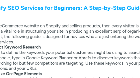 1. If you have an eCommerce website on Shopify and selling products, then every visitor is essential, and SEO plays a vital role in structuring your site in producing an excellent serp of organic traffic. Because of that, the following guide is designed for novices who are just entering the world of Shopify SEO services. **Step 1: Conduct Keyword Research** Start with how to define the keywords your potential customers might be using to search for your product. On Google, type in Google Keyword Planner or Ahrefs to discover keywords that many people are searching for but few competitors are targeting. Use these keywords in your product titles, descriptions, and your URLs. **Step 2: Optimize On-Page Elements** Make sure that you come up with interesting page titles and meta descriptions blending the right keywords in them. Label your pictures with descriptions that explain the images instead of using ‘picture of’ and structure your content with headers. **Step 3: Improve Site Speed** I also came across the knowledge that a site that has content but takes time to load is unfavorable to the end user and does not attract Google’s favor. Optimise images, a host using a faster hosting service, and utilize Shopify image compression applications such as TinyIMG. **Step 4: Build Quality Backlinks** Talk with bloggers and other industry professionals to ensure that you have links that lead back to your Shopify store. It also makes the search engines recommend you as an authoritative sites since they know the quality of the backlinks you provide. **Step 5: Utilize Shopify Apps** Certain Shopify-based apps are there for the optimization procedure like SEO Booster which helps in the easy management of optimization tasks. Shopify SEO services are on an ongoing basis But these steps can help you to get started to drive more traffic and improve your sales.