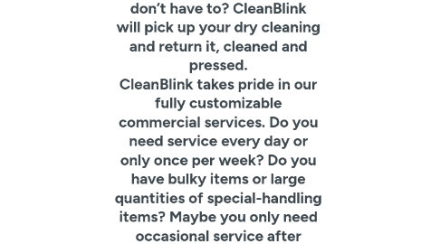 Commercial Laundry and Dry Cleaning Address: 288 Norman Ave, Brooklyn, NY 11222 Phone: (347) 727–1882 Website URL: https://www.cleanblink.com/ About US: Tired of spending hours washing and folding your family’s clothes? Let CleanBlink give you your time back! Our laundry pickup & delivery service is easy to sign up for and even easier to use. Just schedule a pickup and leave your laundry by the door. We’ll wash and fold your items just like you do at home. Choose your detergents, fabric softeners or dryer sheets — all products are included with the service. We’ll deliver your items the next day, smelling amazing and ready to be put away. Whether you’re a young professional or a family of four, your time is important. Why go out of your way to drop your suits and shirts off at the dry cleaners when you don’t have to? CleanBlink will pick up your dry cleaning and return it, cleaned and pressed. CleanBlink takes pride in our fully customizable commercial services. Do you need service every day or only once per week? Do you have bulky items or large quantities of special-handling items? Maybe you only need occasional service after hosting a big event. No matter what you need, we can design a plan that fits your business. We also understand that different industries must meet different requirements. Perhaps local codes require your laundry to be done at a certain minimum temperature. Maybe your patients require allergen-free detergent. Let us know what you require, and we will work hard to make it happen. Related Searches: Laundry service, best laundry service, affordable laundry service, dry cleaner, dry cleaners, dry cleaning service, best dry cleaning service, 24 hour laundry, 24 hours dry cleaning service, commercial laundry, commercial dry cleaning, drop off laundry service, pick up laundry service, best dry cleaning, best laundry, laundry pick up, laundry delivery, Brooklyn, NY Additional Details Working Hours: 8 am — 8 pm Payments: CC, cash