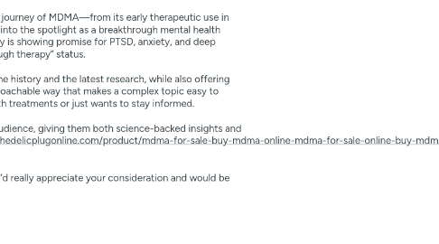 1. Hi, I just published an in-depth article exploring the fascinating journey of MDMA—from its early therapeutic use in the 1980s, through its party-drug reputation, and now back into the spotlight as a breakthrough mental health treatment. The piece highlights how MDMA-assisted therapy is showing promise for PTSD, anxiety, and deep emotional healing, with the FDA even granting it “breakthrough therapy” status. Your readers would find it valuable because it covers both the history and the latest research, while also offering guidance on safe and ethical sourcing. It’s written in an approachable way that makes a complex topic easy to understand, whether someone is curious about mental health treatments or just wants to stay informed. I believe linking to this article would add real value to your audience, giving them both science-backed insights and practical resources. You can check it out here: [https://psychedelicplugonline.com/product/mdma-for-sale-buy-mdma-online-mdma-for-sale-online-buy-mdma/ ]. Would you be open to adding it as a resource on your site? I’d really appreciate your consideration and would be happy to return the favor. Thanks so much for your time! Best, Psychedelic Plug Online