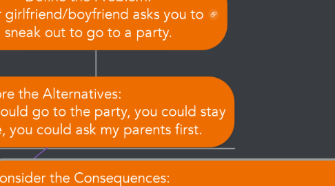 1.1. Consider the Consequences: Go to the party- Negatives: you could get in trouble, and you might make some bad decisions. Positives: you could get away with it but not likely, and it might be a blast. Stay home- Negatives: you'll be bored all night. Positive: you will not get in trouble, and you will not make any bad decisions. Ask parents- Negative: they might say no. Positive: you won't get in trouble, and they might say yes.
