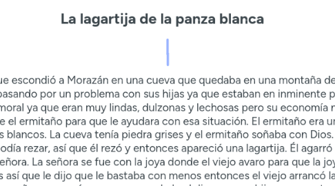 1. La historia comienza con una señora que escondió a Morazán en una cueva que quedaba en una montaña de Tres Ríos. Tiempo después esta señora llamada Doña Anacleta estaba pasando por un problema con sus hijas ya que estaban en inminente peligro, no tenían un estado económico bueno y esto amenazaba su equilibrio moral ya que eran muy lindas, dulzonas y lechosas pero su economía no les permitiría casarse con un hombre así que ella tomó la decisión de ir donde el ermitaño para que le ayudara con esa situación. El ermitaño era un hombre muy flaco y que hablaba despacito, por las tardes él veía ángeles blancos. La cueva tenía piedra grises y el ermitaño soñaba con Dios. Cuando la señora llegó le preguntó si podía rezar, así que él rezó y entonces apareció una lagartija. Él agarró la lagartija, la puso en su mano y la cubrió de esmeraldas y eso le dió a la señora. La señora se fue con la joya donde el viejo avaro para que la joya fuera valorada, la señora avergonzada no quería tantos doblones así que le dijo que le bastaba con menos entonces el viejo arrancó las esmeraldas que tenía en la panza para que no se viera mucho y le pagó. La señora regresó a su casa para darle el dinero a sus hijas y con esto ellas pudieron casarse con un caballero. Después de esto la señora pensó que no necesitaba todo ese dinero ya que era mucho para su humilde felicidad así que decidió subir hasta donde estaba el ermitaño para regresarle la fría, dura y pesada lagartija así que el ermitaño agarro la lagartija con sus manos de brujo y la echó a andar. Por esto dicen que desde “aquel tiempo” todas las lagartijas de ese lugar tienen la espalda verde y la panza blanca.