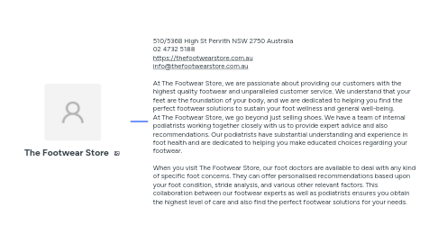 1. 510/536B High St Penrith NSW 2750 Australia 02 4732 5188 https://thefootwearstore.com.au info@thefootwearstore.com.au At The Footwear Store, we are passionate about providing our customers with the highest quality footwear and unparalleled customer service. We understand that your feet are the foundation of your body, and we are dedicated to helping you find the perfect footwear solutions to sustain your foot wellness and general well-being. At The Footwear Store, we go beyond just selling shoes. We have a team of internal podiatrists working together closely with us to provide expert advice and also recommendations. Our podiatrists have substantial understanding and experience in foot health and are dedicated to helping you make educated choices regarding your footwear. When you visit The Footwear Store, our foot doctors are available to deal with any kind of specific foot concerns. They can offer personalised recommendations based upon your foot condition, stride analysis, and various other relevant factors. This collaboration between our footwear experts as well as podiatrists ensures you obtain the highest level of care and also find the perfect footwear solutions for your needs.