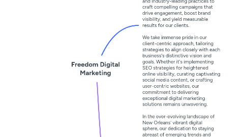 1. Nestled within the vibrant tapestry of culture and commerce in New Orleans, Louisiana, Freedom Digital Marketing stands as a catalyst for businesses seeking to thrive in the digital realm. Our strategically located business embodies innovation, expertise, and a commitment to delivering tailored and impactful digital marketing solutions to empower enterprises in New Orleans and its surrounding areas. Strategically positioned within New Orleans' diverse business districts and rich cultural landscape, Freedom Digital Marketing offers a comprehensive suite of digital marketing services. This strategic placement underscores our dedication to delivering efficient, high-quality, and customized marketing strategies that resonate with the unique objectives and audiences of businesses across various industries. At Freedom Digital Marketing, our specialized services encompass a wide spectrum of digital marketing disciplines, including search engine optimization (SEO), social media marketing, pay-per-click (PPC) advertising, content creation, email marketing, and website design and development. Our team of adept digital marketers leverages cutting-edge tools, data-driven insights, and industry-leading practices to craft compelling campaigns that drive engagement, boost brand visibility, and yield measurable results for our clients. We take immense pride in our client-centric approach, tailoring strategies to align closely with each business's distinctive vision and goals. Whether it's implementing SEO strategies for heightened online visibility, curating captivating social media content, or crafting user-centric websites, our commitment to delivering exceptional digital marketing solutions remains unwavering. In the ever-evolving landscape of New Orleans' vibrant digital sphere, our dedication to staying abreast of emerging trends and pioneering technologies is crucial. We continually innovate, adapt, and leverage the latest methodologies in digital marketing to ensure our clients maintain a competitive edge in their respective industries. Freedom Digital Marketing's presence in New Orleans signifies more than offering digital marketing services; it embodies innovation, expertise, and an unwavering commitment to enhancing businesses' online presence and success. Our local presence underscores our dedication to providing New Orleans businesses with top-tier digital marketing solutions, enabling them to flourish, expand their digital footprint, and achieve unprecedented success within the diverse and culturally rich community of New Orleans.