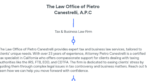 1.1. The Law Office of Pietro Canestrelli provides expert tax and business law services, tailored to clients’ unique needs. With over 23 years of experience, Attorney Pietro Canestrelli is a certified tax specialist in California who offers compassionate support for clients dealing with taxing authorities like the IRS, FTB, EDD, and CDTFA. The firm is dedicated to easing clients’ stress by guiding them through complex legal issues in tax controversy and business matters. Reach out to learn how we can help you move forward with confidence.