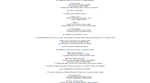 Meu novo mapa mental Aqui está um mapa mental mais detalhado e refinado do livro O Mal-Estar na Civilização (Das Unbehagen in der Kultur) de Sigmund Freud. 📌 MAPA MENTAL – O MAL-ESTAR NA CIVILIZAÇÃO (SIGMUND FREUD) 🧠 IDEIA CENTRAL: 🔹 A civilização é necessária para a sobrevivência humana, mas impõe restrições aos desejos individuais, gerando insatisfação e sofrimento. 1️⃣ A ORIGEM DO MAL-ESTAR ➡️ O ser humano busca prazer e satisfação, mas a sociedade impõe regras para garantir a convivência. ➡️ Essa imposição gera um conflito psíquico entre desejos individuais e normas coletivas. ➡️ A repressão dos impulsos leva ao mal-estar e à frustração permanente. 📌 Conceitos-chave: • Princípio do Prazer 🆚 Princípio da Realidade • O ser humano busca prazer imediato. • A sociedade impõe limites, obrigando a adiar ou renunciar a certos prazeres. 2️⃣ O PAPEL DA CIVILIZAÇÃO A civilização impõe três elementos principais: ✔️ Normas e Leis ⚖️ • Regulam o comportamento para manter a ordem. • Limitam a liberdade individual. ✔️ Religião ⛪ • Funciona como um sistema de controle psíquico. • Promete felicidade futura em troca da renúncia ao prazer presente. ✔️ Arte e Cultura 🎭 • Permitem a sublimação dos instintos reprimidos. • A criatividade serve como uma válvula de escape. 3️⃣ O SUPEREGO E O SENTIMENTO DE CULPA 📌 A sociedade impõe regras externas, mas essas regras são internalizadas pelo Superego (estrutura psíquica que Freud descreve como a “consciência moral”). ➡️ Quanto mais a civilização evolui, mais repressão é exigida. ➡️ O resultado é um sentimento constante de culpa. ➡️ A culpa pode ser inconsciente, gerando neuroses e ansiedade. 4️⃣ OS DOIS INSTINTOS HUMANOS EM CONFLITO Freud identifica duas forças opostas que regem o comportamento humano: 🔵 Eros (Instinto de Vida) 💙 • Busca prazer, amor, conexão e criatividade. • A civilização tenta reforçar esse instinto para manter a ordem. 🔴 Thanatos (Instinto de Morte) ❤️ • Manifesta-se como agressividade, destruição e autossabotagem. • Explica guerras, violência e sofrimento humano. • A sociedade tenta suprimir, mas esse instinto sempre encontra novas formas de se expressar. 📌 Conclusão: A civilização precisa reprimir Thanatos para sobreviver, mas essa repressão também causa infelicidade. 5️⃣ AS CONSEQUÊNCIAS DO MAL-ESTAR NA CIVILIZAÇÃO 📌 O ser humano nunca pode ser totalmente feliz dentro da civilização, pois há um custo psicológico inevitável. ❌ Insatisfação Crônica • A repressão dos desejos gera frustração constante. • A busca pela felicidade plena é sempre frustrada. ❌ Neurose e Sofrimento Psíquico • A repressão dos instintos gera ansiedade, depressão e doenças psicológicas. • O sentimento de culpa pode ser inconsciente e difícil de eliminar. ❌ Agressividade e Violência • A civilização não consegue eliminar a agressividade, apenas redirecioná-la. • A guerra e a criminalidade são expressões reprimidas do instinto de morte. 6️⃣ REFLEXÕES FINAIS ✔️ A civilização é um mal necessário: sem ela, viveríamos em um estado de guerra constante. ✔️ O preço da civilização é a infelicidade individual, pois exige repressão dos desejos. ✔️ A felicidade plena nunca será alcançada, pois o conflito entre desejo e repressão é inerente à condição humana. ✔️ A arte, a cultura e a criatividade são formas de aliviar o mal-estar, mas nunca o eliminam totalmente.