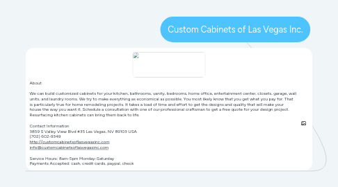 1. About We can build customized cabinets for your kitchen, bathrooms, vanity, bedrooms, home office, entertainment center, closets, garage, wall units, and laundry rooms. We try to make everything as economical as possible. You most likely know that you get what you pay for. That is particularly true for home remodeling projects. It takes a load of time and effort to get the designs and quality that will make your house the way you want it. Schedule a consultation with one of our professional craftsman to get a free quote for your design project. Resurfacing kitchen cabinets can bring them back to life. Contact Information 3859 S Valley View Blvd #35 Las Vegas, NV 89103 USA (702) 602-9349 http://customcabinetsoflasvegasinc.com info@customcabinetsoflasvegasinc.com Service Hours: 8am-5pm Monday-Saturday Payments Accepted: cash, credit cards, paypal, check
