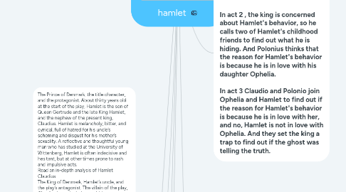 6. In act 1 is when the ghost of Hamlet's father appears and he tells him that his brother was the one who killed him, so Hamlet decides to avenge his father's death. In act 2 , the king is concerned about Hamlet's behavior, so he calls two of Hamlet's childhood friends to find out what he is hiding. And Polonius thinks that the reason for Hamlet's behavior is because he is in love with his daughter Ophelia. In act 3 Claudio and Polonio join Ophelia and Hamlet to find out if the reason for Hamlet's behavior is because he is in love with her, and no, Hamlet is not in love with Ophelia. And they set the king a trap to find out if the ghost was telling the truth.