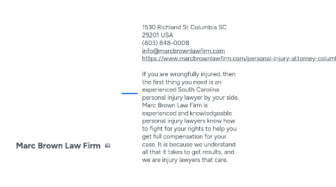 1. 1530 Richland St Columbia SC 29201 USA (803) 848-0008 info@marcbrownlawfirm.com https://www.marcbrownlawfirm.com/personal-injury-attorney-columbia/ If you are wrongfully injured, then the first thing you need is an experienced South Carolina personal injury lawyer by your side. Marc Brown Law Firm is experienced and knowledgeable personal injury lawyers know how to fight for your rights to help you get full compensation for your case. It is because we understand all that it takes to get results, and we are injury lawyers that care.