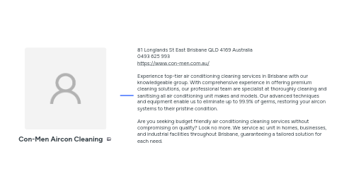 1. 81 Longlands St East Brisbane QLD 4169 Australia 0493 625 993 https://www.con-men.com.au/ Experience top-tier air conditioning cleaning services in Brisbane with our knowledgeable group. With comprehensive experience in offering premium cleaning solutions, our professional team are specialist at thoroughly cleaning and sanitising all air conditioning unit makes and models. Our advanced techniques and equipment enable us to eliminate up to 99.9% of germs, restoring your aircon systems to their pristine condition. Are you seeking budget friendly air conditioning cleaning services without compromising on quality? Look no more. We service ac unit in homes, businesses, and industrial facilities throughout Brisbane, guaranteeing a tailored solution for each need.