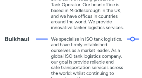 1. Bulkhaul is a leading global ISO Tank Operator. Our head office is based in Middlesbrough in the UK, and we have offices in countries around the world. We provide innovative tanker logistics services. We specialise in ISO tank logistics, and have firmly established ourselves as a market leader. As a global ISO tank logistics company, our goal is provide reliable and safe transportation services across the world; whilst continuing to innovate and improve.