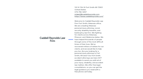 1. 122 N 11th St Fort Smith AR 72901 United States 479-782-5297 intake3@caddellreynolds.com https://www.caddellreynolds.com/ Welcome to Caddell Reynolds Law Firm Fort Smith, Arkansas office. We are a leading Arkansas personal injury attorney, social security disability benefits, and bankruptcy law firm. We fighting for clients across Arkansas, Missouri, and Oklahoma states. We have helped thousands of people through some of the most difficult times of their lives. We’ve recovered millions of dollars for our clients, and we would like to help you too. Are you looking for a personal injury attorney in Fort Smith, AR area? Our Fort Smith accident attorneys are here 24/7 available to assist you with all of your injury, disability, and accident law matters. We offer free legal consultations, so you can get the legal guidance you need with a free phone call today.