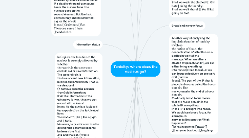 28. Another way of analysing the linguistic function of tonicity involves the notion of focus: the concentration of attention on a particular part of the message. When we utter a stretch of speech (an IP), we can either bring everything into focus (broad focus), or we can focus selectively on one part of it (narrow focus). The part of the IP that is placed in focus is called the focus domain. The nucleus marks the end of a focus domain. Maximally broad focus means that the focus domain is the whole IP: everything in the IP is brought into focus. We would use broad focus, for example, in answer to the question What happened?: What happened next? Everyone burst out laughing.