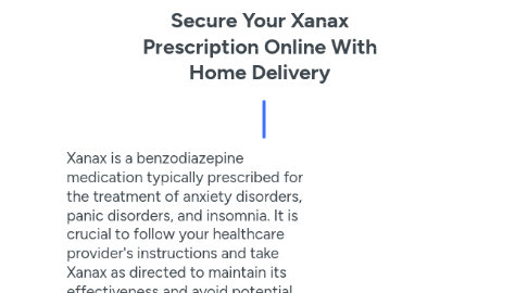 1. Xanax is a benzodiazepine medication typically prescribed for the treatment of anxiety disorders, panic disorders, and insomnia. It is crucial to follow your healthcare provider's instructions and take Xanax as directed to maintain its effectiveness and avoid potential side effects or risks. If you have a stable prescription and are running low on your medication, online pharmacies can help you avoid the inconvenience of visiting a physical pharmacy. Here are some steps to secure your Xanax prescription online and enjoy home delivery Order link : https://xanax-texas-medical.amebaownd.com/