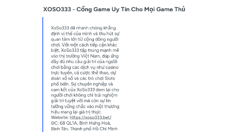 1. XoSo333 đã nhanh chóng khẳng định vị thế của mình và thu hút sự quan tâm lớn từ cộng đồng người chơi. Với một cách tiếp cận khác biệt, XoSo333 tập trung mạnh mẽ vào thị trường Việt Nam, đáp ứng đầy đủ nhu cầu giải trí của người chơi bằng các dịch vụ như casino trực tuyến, cá cược thể thao, dự đoán xổ số và các trò chơi Slots phổ biến. Sự chuyên nghiệp và cam kết của XoSo333 đem lại cho người chơi không chỉ trải nghiệm giải trí tuyệt vời mà còn sự tin tưởng vững chắc vào một thương hiệu mang lại giá trị thực. Website: https://xoso333.bet/ ĐC: 68 QL1A, Bình Hưng Hoà, Bình Tân, Thành phố Hồ Chí Minh SĐT: 0966667575 Email: Xoso333bet@gmail.com Hashtag #xoso333 #trang_chu_xoso333 #link_xoso333 #nha_cai_xoso333 Social: https://www.facebook.com/xoso333bet/ https://www.youtube.com/@xoso333bet https://groups.google.com/g/xoso333bet/ https://x.com/xoso333bet https://www.pinterest.com/xoso333bet/ https://www.linkedin.com/in/xoso333bet/ https://xoso333bet.tumblr.com/ https://vimeo.com/xoso333bet https://www.reddit.com/user/xoso333bet/ https://soundcloud.com/xoso333bet https://medium.com/@xoso333bet/about https://www.iglinks.io/xoso333bet-hic?preview=true https://xoso333bet.gitbook.io/untitled/ https://chillspot1.com/user/xoso333bet https://xoso333bet1.shopinfo.jp/posts/54558542 https://www.shippingexplorer.net/en/user/xoso333bet/108944 https://velopiter.spb.ru/profile/120915-xoso333bet/?tab=field_core_pfield_1