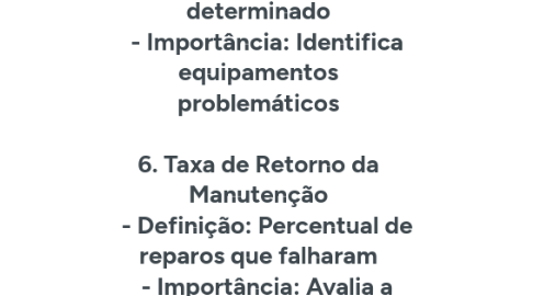 Embora eu não consiga criar mapas mentais visualmente, posso descrevê-lo de forma estruturada para que você possa desenhar ou usar uma ferramenta de mapeamento mental. Abaixo está um exemplo de como organizar os principais indicadores de desempenho na manutenção em um formato de mapa mental: ### Mapa Mental: Indicadores de Desempenho na Manutenção **Centro: Indicadores de Desempenho na Manutenção** 1. **Disponibilidade** - Definição: Tempo em que o equipamento está funcionante - Fórmula: (Tempo em Uso / Tempo Total) x 100 2. **MTTR (Tempo Médio de Reparo)** - Definição: Tempo médio para reparar um equipamento - Importância: Avalia a eficiência do processo de manutenção 3. **MTBF (Tempo Médio Entre Falhas)** - Definição: Tempo médio de operação entre falhas - Importância: Mede a confiabilidade do equipamento 4. **Custo de Manutenção** - Definição: Total gasto com manutenção - Medidas: Custo absoluto ou percentual sobre custos operacionais 5. **Índice de Falhas** - Definição: Número de falhas em um período determinado - Importância: Identifica equipamentos problemáticos 6. **Taxa de Retorno da Manutenção** - Definição: Percentual de reparos que falharam - Importância: Avalia a qualidade dos serviços de manutenção 7. **Tempo de Inatividade (Downtime)** - Definição: Total de tempo fora de operação - Tipos: Planejado e não planejado 8. **Eficiência Geral do Equipamento (OEE)** - Componentes: Disponibilidade, desempenho, qualidade - Importância: Avalia a eficiência produtiva 9. **Programação de Manutenção (PMR)** - Definição: Percentual de manutenção planejada - Importância: Ajuda a reduzir custos e paradas inesperadas 10. **Satisfação do Cliente** - Definição: Avaliação da satisfação dos usuários - Importância: Impacta diretamente na produtividade e no moral da equipe ### Sugestões para Visualização - Use um círculo central para "Indicadores de Desempenho na Manutenção". - Para cada indicador, desenhe ramificações que forneçam definições, fórmulas e importâncias. - Use cores e ícones diferentes para cada indicador para facilitar o entendimento visual. Você pode usar ferramentas online como MindMeister, XMind ou até mesmo papel e caneta para criar o mapa mental baseado na estrutura acima. Espero que isso ajude!