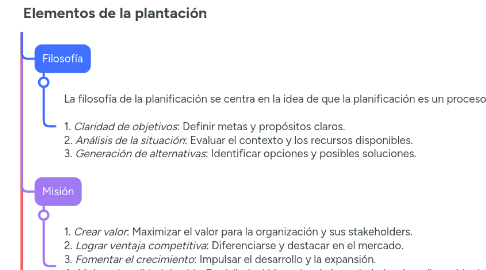 2.1. 1. _Crear valor_: Maximizar el valor para la organización y sus stakeholders. 2. _Lograr ventaja competitiva_: Diferenciarse y destacar en el mercado. 3. _Fomentar el crecimiento_: Impulsar el desarrollo y la expansión. 4. _Mejorar la calidad de vida_: Contribuir al bienestar de la sociedad y el medio ambiente. La misión de la planificación es esencial para el éxito y la sostenibilidad de cualquier organización o proyecto.