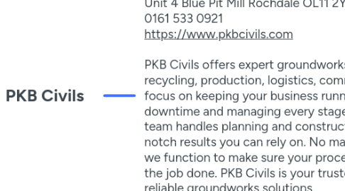 1. Unit 4 Blue Pit Mill Rochdale OL11 2YW England 0161 533 0921 https://www.pkbcivils.com PKB Civils offers expert groundworks and civil design services for the recycling, production, logistics, commercial, and port sectors. We focus on keeping your business running smoothly by reducing downtime and managing every stage of your job with care. Our in-house team handles planning and construction to provide safe, top notch results you can rely on. No matter the dimension of the work, we function to make sure your procedures stay on track while we get the job done. PKB Civils is your trusted companion for effective, reliable groundworks solutions.
