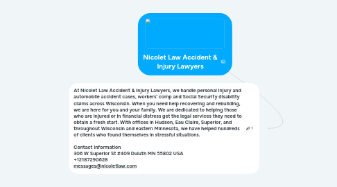 1. At Nicolet Law Accident & Injury Lawyers, we handle personal injury and automobile accident cases, workers' comp and Social Security disability claims across Wisconsin. When you need help recovering and rebuilding, we are here for you and your family. We are dedicated to helping those who are injured or in financial distress get the legal services they need to obtain a fresh start. With offices in Hudson, Eau Claire, Superior, and throughout Wisconsin and eastern Minnesota, we have helped hundreds of clients who found themselves in stressful situations. Contact Information 306 W Superior St #409 Duluth MN 55802 USA +12187290628 messages@nicoletlaw.com
