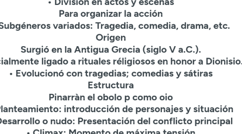 Definición Es un género literarió destinado a ser representado en un escenario. Sus obras muestran conflictos y emociones a través de los personajes y el diálogo. Busca generar experiencia y reflexión en el espectador. GÉNERO DRAMÁTICO Caracteristicas • Dialogo: Medio principal de comunicación • Acción dramática: Los hechos se muestran mas que se narran • Presencia escénica: Pensado para ser actuado • Conflicto central: Motor de la obra • División en actos y escenas Para organizar la acción • Subgéneros variados: Tragedia, comedia, drama, etc. Origen Surgió en la Antigua Grecia (siglo V a.C.). • Inicialmente ligado a rituales réligiosos en honor a Dionisio. • Evolucionó con tragedias; comedias y sátiras Estructura Pinarràn el obolo p como oio • Planteamiento: introducción de personajes y situación • Desarrollo o nudo: Presentación del conflicto principal • Climax; Momento de máxima tensión • Desenlace: Resolución del conflicto División en actos y escenes: Para oganizar la acción • Subgéneros váriados. Tragedia, comedia, drama, etc. Géneros Personajes Personajes: Protagonista, antagonista y secundarios • Acción: Lo que ocurre en la obra • Dialogo: Conversaciones entre los personajes • Escenario: Lugar donde se desarrolla la acción • Tiempo: Epoca y duracion de los hechos • Conflicto: Problema que impulsa la tram