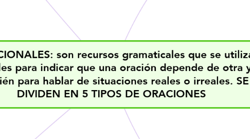 CONDICIONALES: son recursos gramaticales que se utilizan en el ingles para indicar que una oración depende de otra y también para hablar de situaciones reales o irreales. SE DIVIDEN EN 5 TIPOS DE ORACIONES 作者: Mind Map: CONDICIONALES: son recursos gramaticales que se utilizan en el ingles para indicar que una oración depende de otra y también para hablar de situaciones reales o irreales. SE DIVIDEN EN 5 TIPOS DE ORACIONES