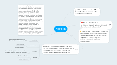 1. Cultural Diversity (Equity, Inclusion, Awareness): - as a non-profit group funded by the Ontario Ministry of Children and Youth Services, KidsAbility does seem to provide Speech-Language support in other languages other than our two official languages (French and English) though the reference to those other languages takes you directly to the Ministry web site. As with ESL and ELL families at school, a first step with KidsAbility may be a referral meeting with an interpreter. -website is entirely in English and I am presuming that most services are offered in English with wait-times for SLP in other languages. As such, wait times and secondary referrals often mean inequity in obtaining services. However, the KidsAbility mandate is equity, inclusion, and awareness for people with special needs. There mandate is not, also, second language learning though there is a need (with First Nations and immigrant populations) to further provide services that our culturally sensitive or those populations are at risk for not benefiting from KidsAbility.