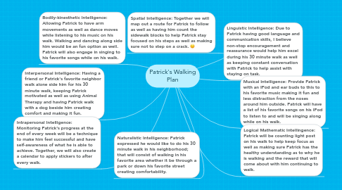 1. Naturalistic Intelligence: Patrick expressed he would like to do his 30 minute walk in his neighborhood; that will consist of walking in his favorite area whether it be through a park or down his favorite street creating comfortability.