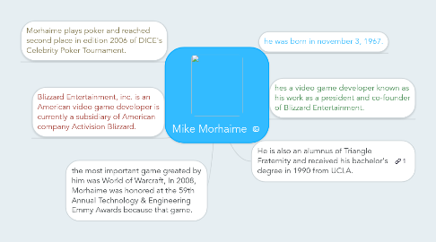 2. the most important game greated by him was World of Warcraft, In 2008, Morhaime was honored at the 59th Annual Technology & Engineering Emmy Awards because that game.
